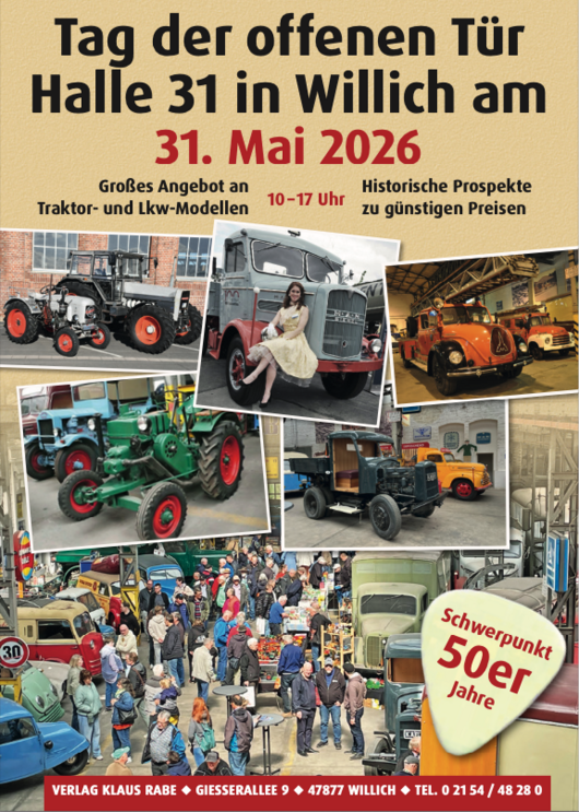 Freuen Sie sich auf ein großes Angebot an historischen Prospekten sowie Traktor- und Lkw-Modelle zu attraktiven Preisen. Tauchen Sie ein in vergangene Zeiten, stöbern Sie in Erinnerungen und lassen Sie sich von der Atmosphäre der 50er-Jahre verzaubern.